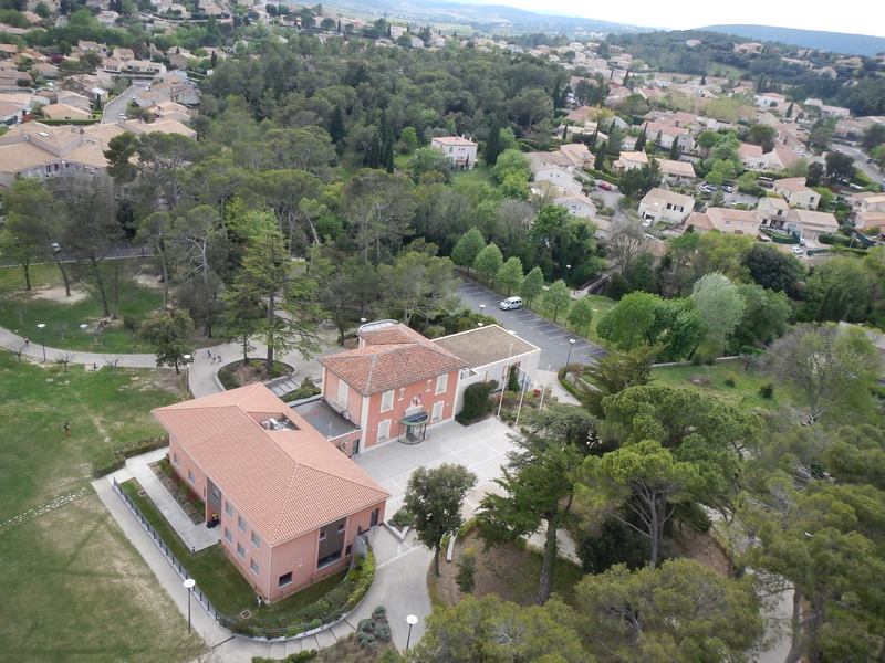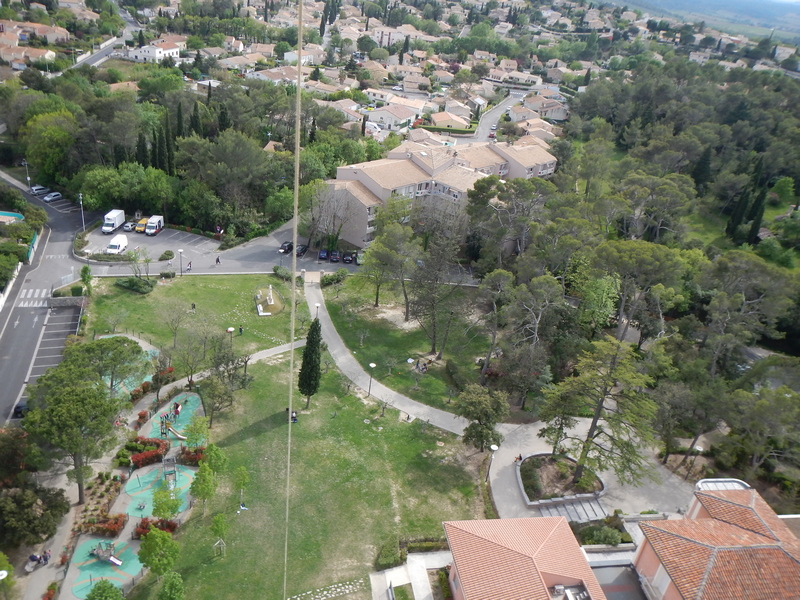 Le parc de la mairie, au cœur du vieux village, est un lieu de convivialité très prisé par les enfants, les personnes âgées et les promeneurs, en quête d’un lieu fleuri et arboré pour une pose ou un pique-nique. Depuis ce parc, nous avons réalisé nos premières photos aériennes urbaines avec des cerfs-volants, malgré la proximité de grands pins, des bâtiments municipaux et des maisons parfois hautes ; un exercice de pilotage expert avant de trouver le flux laminaire propice à la photographie, 50 m plus haut, au-dessus des toits.