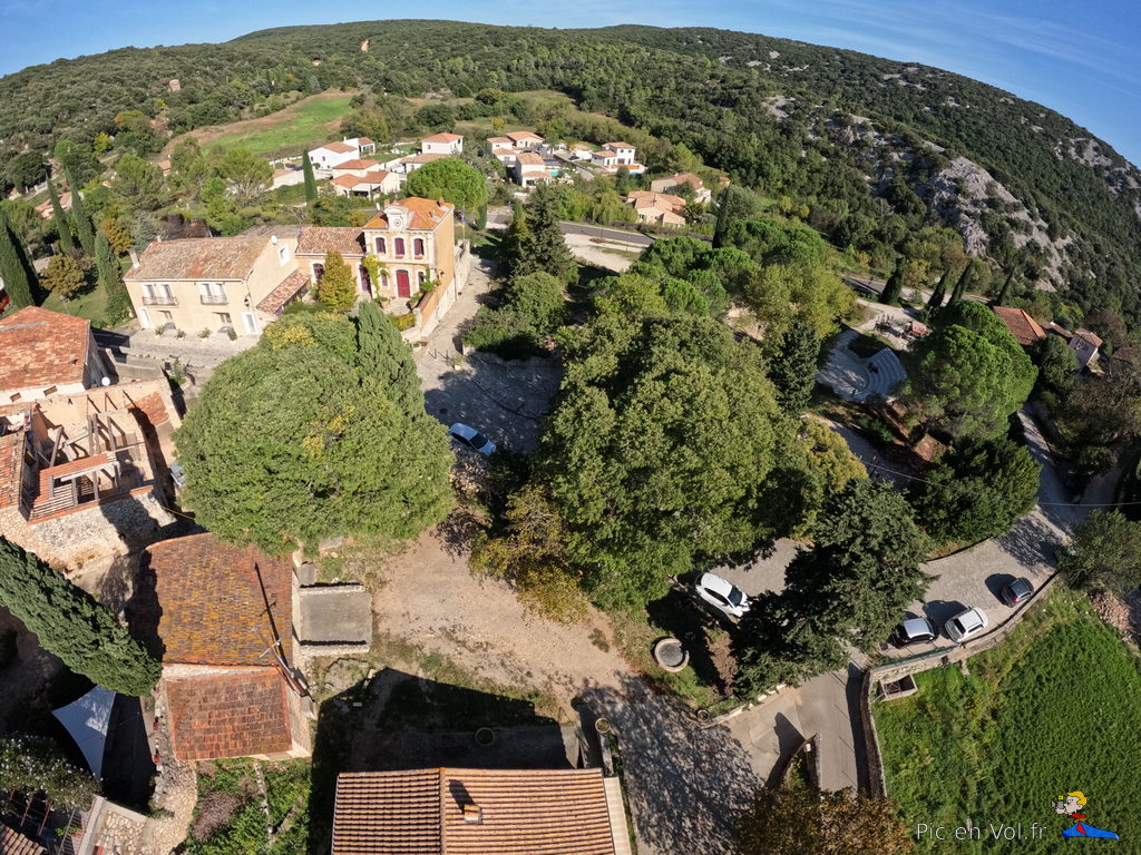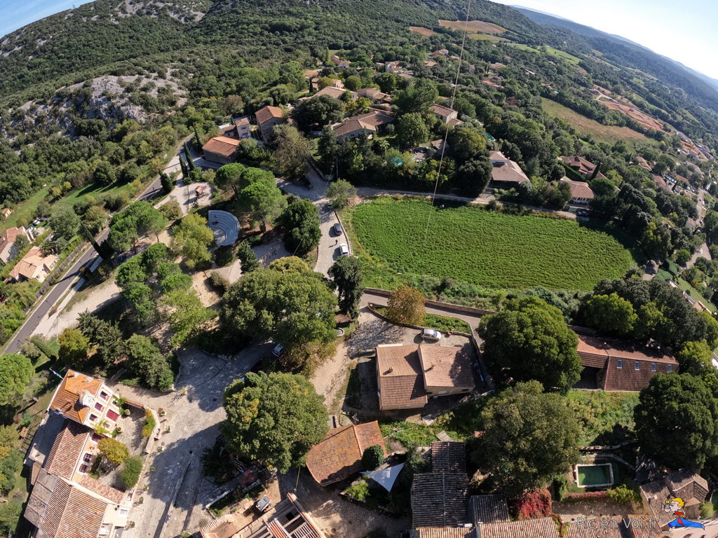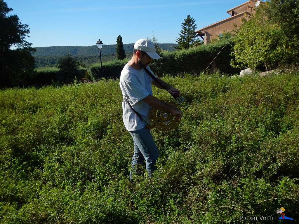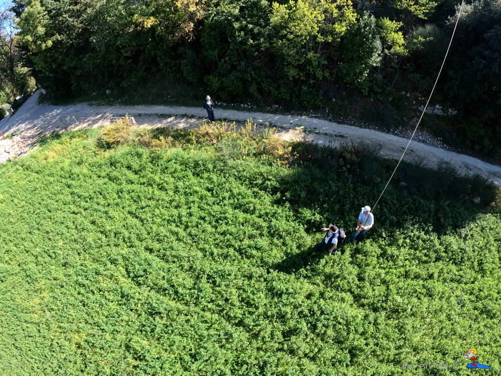 Il nous aura fallu pas moins de trois reportages pour essayer de comprendre l’aérologie si particulière de cet endroit. Voler au-dessus de Murles, en décollant au centre du village, relevait du challenge improbable. Mistral, Tramontane ou brises… vu le relief, les cerfs-volants ont, ici, des velléités de vols libres avec atterrissages sur les toits ou dans les arbres assurés. Aujourd’hui, c’est une petite brise de sud qui nous a permis un envol depuis un champ de luzerne situé au cœur du village, un paradoxe dans cet endroit si exigu, coincé entre un passé rural et historique et la modernité d’une urbanisation galopante dans la plaine, autrefois cultivée. Quoi qu’il en soit, nous avons dû être trois pilotes à nous relayer pour assurer plusieurs tentatives d’envols difficiles et scabreux, et enfin, pouvoir élever nos nacelles et leurs appareils photos. Deux heures de combats avec et contre le vent et plus d’un kilomètre de manipulations de lignes, pour quelques minutes de survol et une dizaine de clichés non floutés ; les 1000 ans d’histoire de ce village en valaient la peine. Interpellés par un ancien, inquiet de notre présence dans son champ de luzerne, sans clôtures, nous lui avons expliqué notre démarche et nous l’avons aussi rassuré par nos précautions pour ne pas piétiner le précieux fourrage. À Murles l’église St-Jean-Baptiste est en « quarantaine », située en limite de la commune. Nous avons donc pris notre envol sur un espace coincé entre les trois cimetières enserrant la bâtisse romane, un terrain vague envahi de hautes graminées aux jolis reflets roses. Les arbres, coté sud, et les hautes collines tout autour, nous offraient des conditions aérologiques pas vraiment idéales, une fois encore.