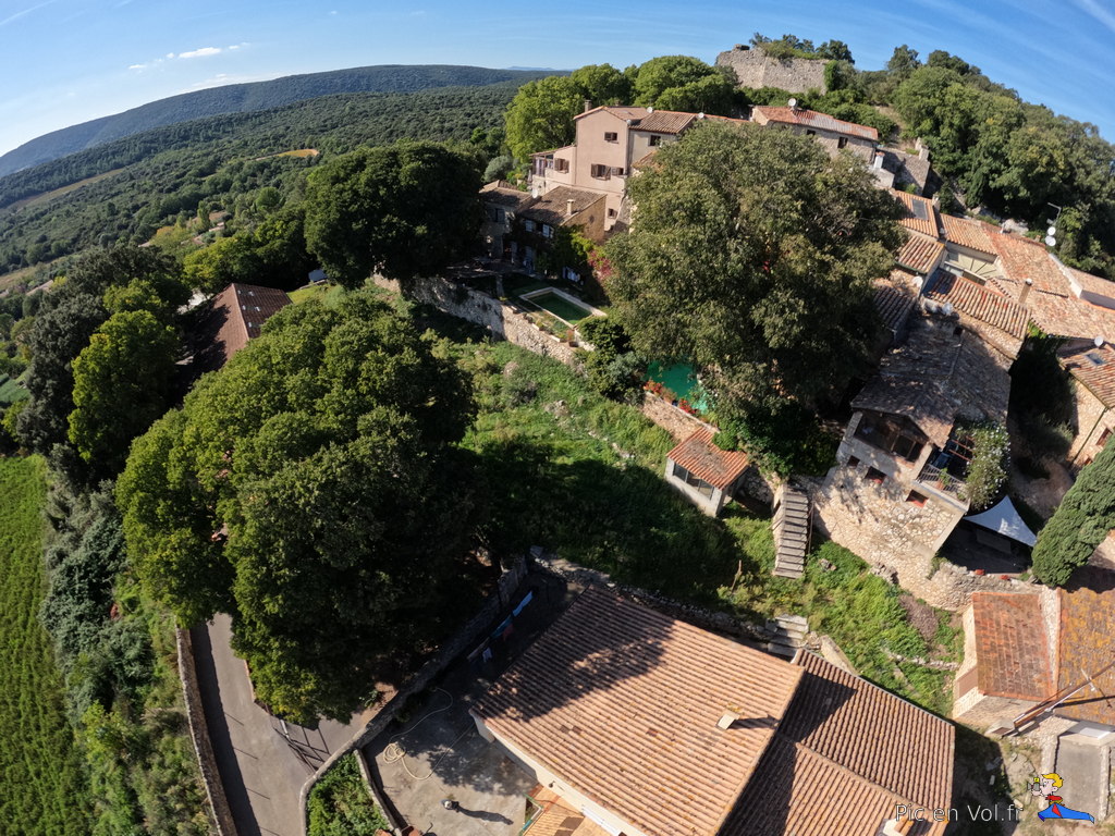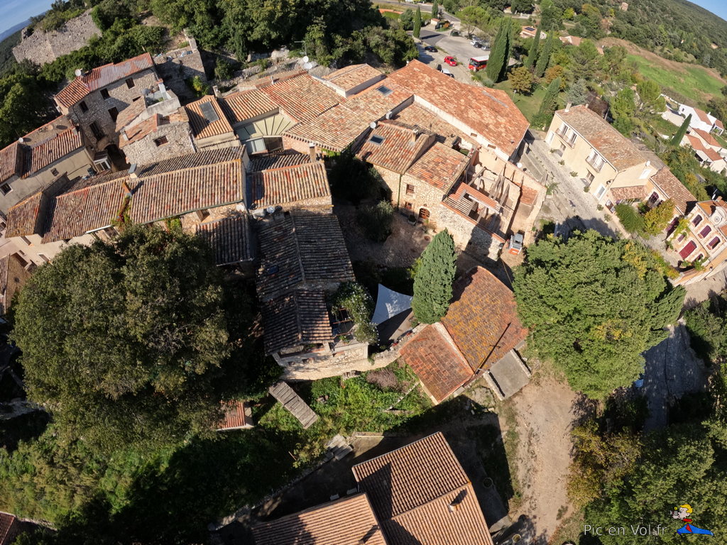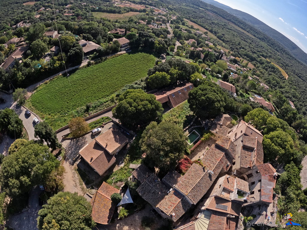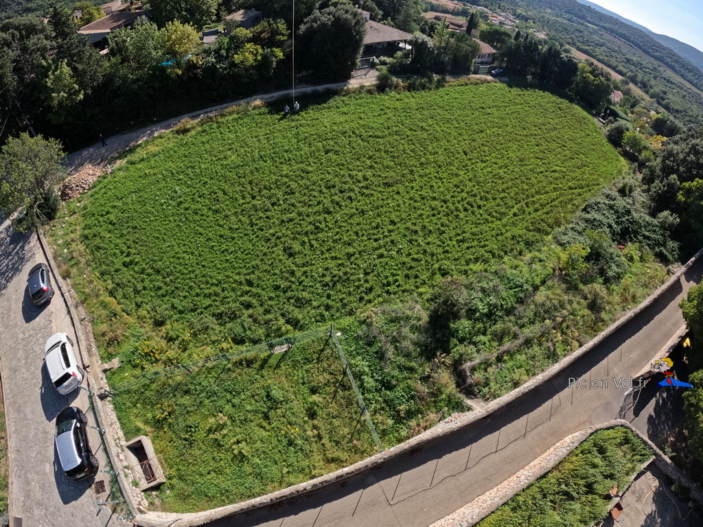 Il nous aura fallu pas moins de trois reportages pour essayer de comprendre l’aérologie si particulière de cet endroit. Voler au-dessus de Murles, en décollant au centre du village, relevait du challenge improbable. Mistral, Tramontane ou brises… vu le relief, les cerfs-volants ont, ici, des velléités de vols libres avec atterrissages sur les toits ou dans les arbres assurés. Aujourd’hui, c’est une petite brise de sud qui nous a permis un envol depuis un champ de luzerne situé au cœur du village, un paradoxe dans cet endroit si exigu, coincé entre un passé rural et historique et la modernité d’une urbanisation galopante dans la plaine, autrefois cultivée. Quoi qu’il en soit, nous avons dû être trois pilotes à nous relayer pour assurer plusieurs tentatives d’envols difficiles et scabreux, et enfin, pouvoir élever nos nacelles et leurs appareils photos. Deux heures de combats avec et contre le vent et plus d’un kilomètre de manipulations de lignes, pour quelques minutes de survol et une dizaine de clichés non floutés ; les 1000 ans d’histoire de ce village en valaient la peine. Interpellés par un ancien, inquiet de notre présence dans son champ de luzerne, sans clôtures, nous lui avons expliqué notre démarche et nous l’avons aussi rassuré par nos précautions pour ne pas piétiner le précieux fourrage. À Murles l’église St-Jean-Baptiste est en « quarantaine », située en limite de la commune. Nous avons donc pris notre envol sur un espace coincé entre les trois cimetières enserrant la bâtisse romane, un terrain vague envahi de hautes graminées aux jolis reflets roses. Les arbres, coté sud, et les hautes collines tout autour, nous offraient des conditions aérologiques pas vraiment idéales, une fois encore.