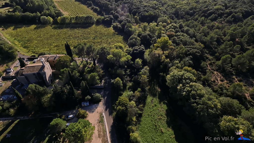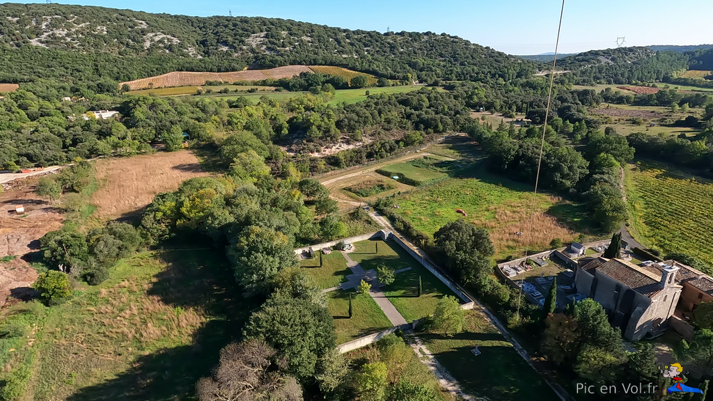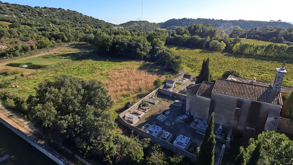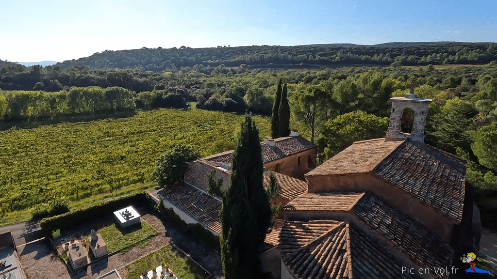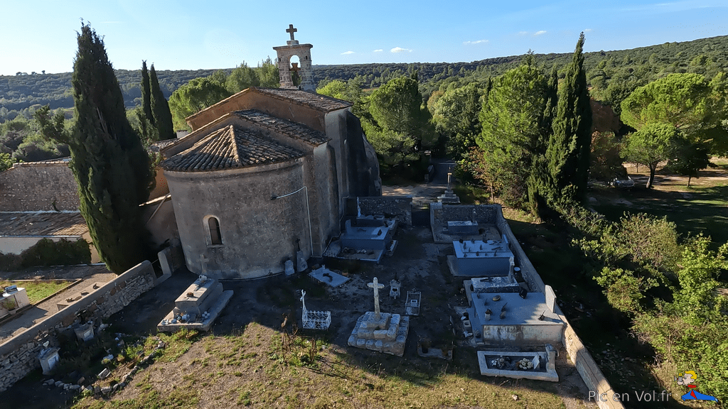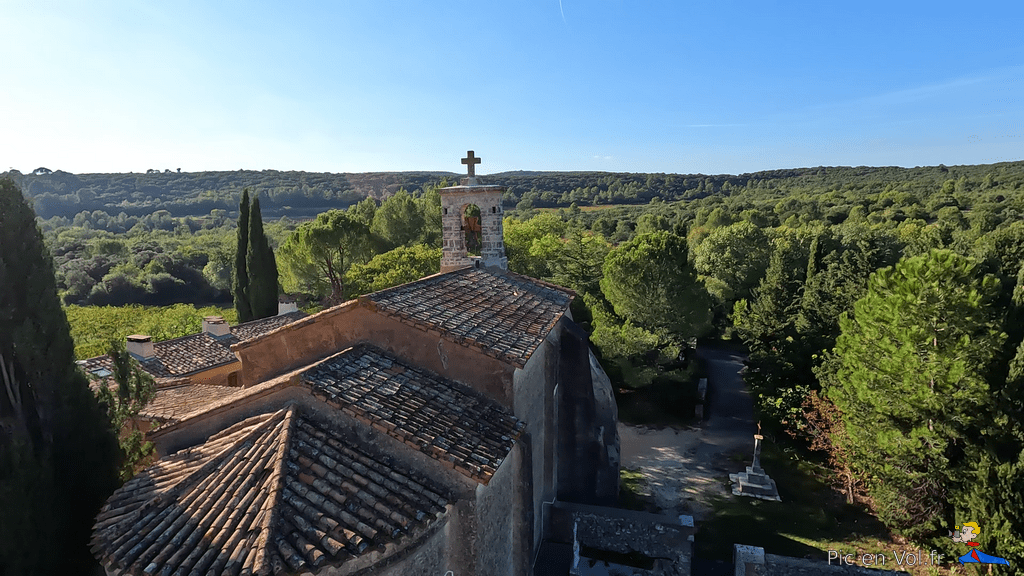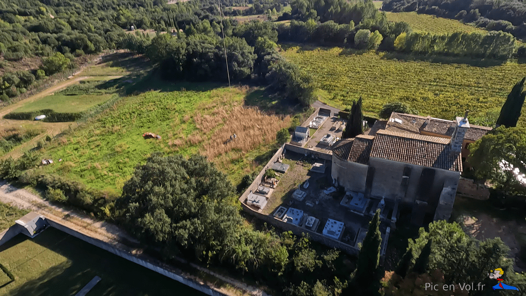 À Murles, l’église Saint-Jean-Baptiste est comme en « quarantaine », isolée à l’extérieur en limite de la commune. Pour réaliser son « shooting » nous avons donc pris notre envol sur un espace coincé entre les trois cimetières enserrant la bâtisse romane, sur un terrain vague envahi de hautes graminées aux jolis reflets roses. Les arbres, du côté sud et les hautes collines, tout autour, nous offraient, une fois encore, des conditions aérologiques pas vraiment idéales.
