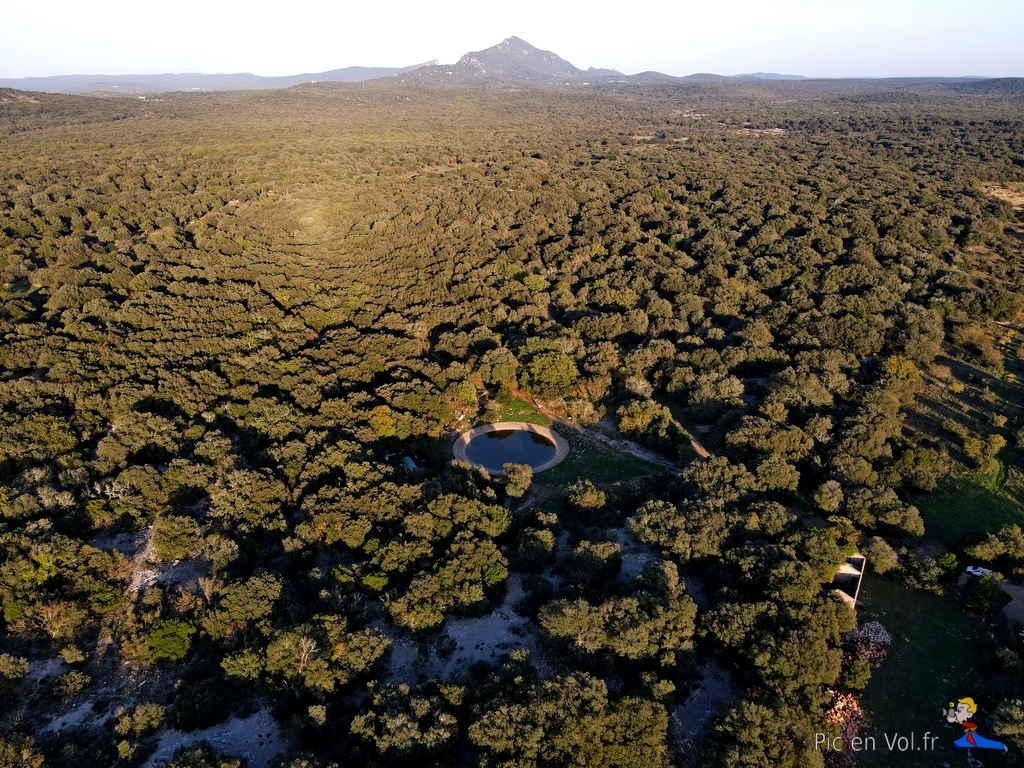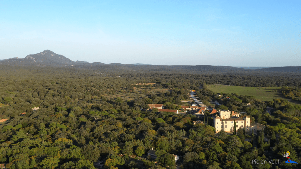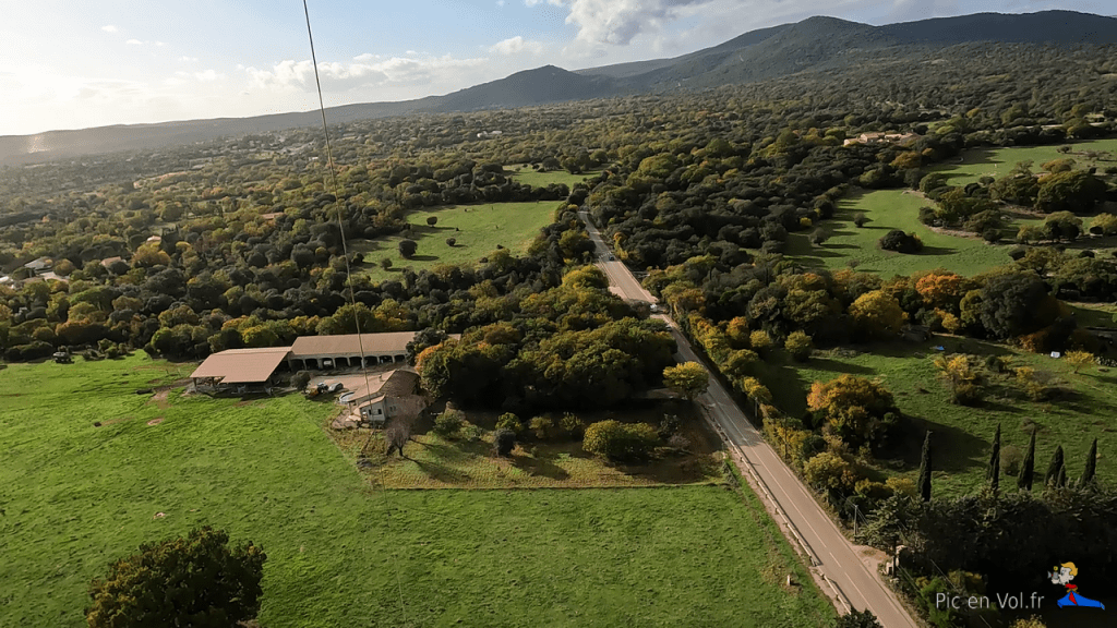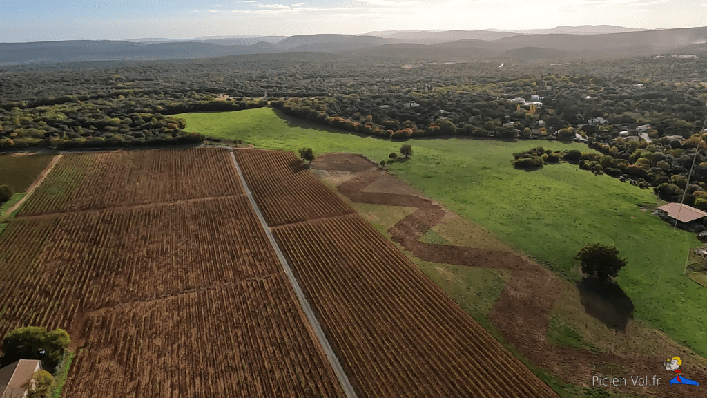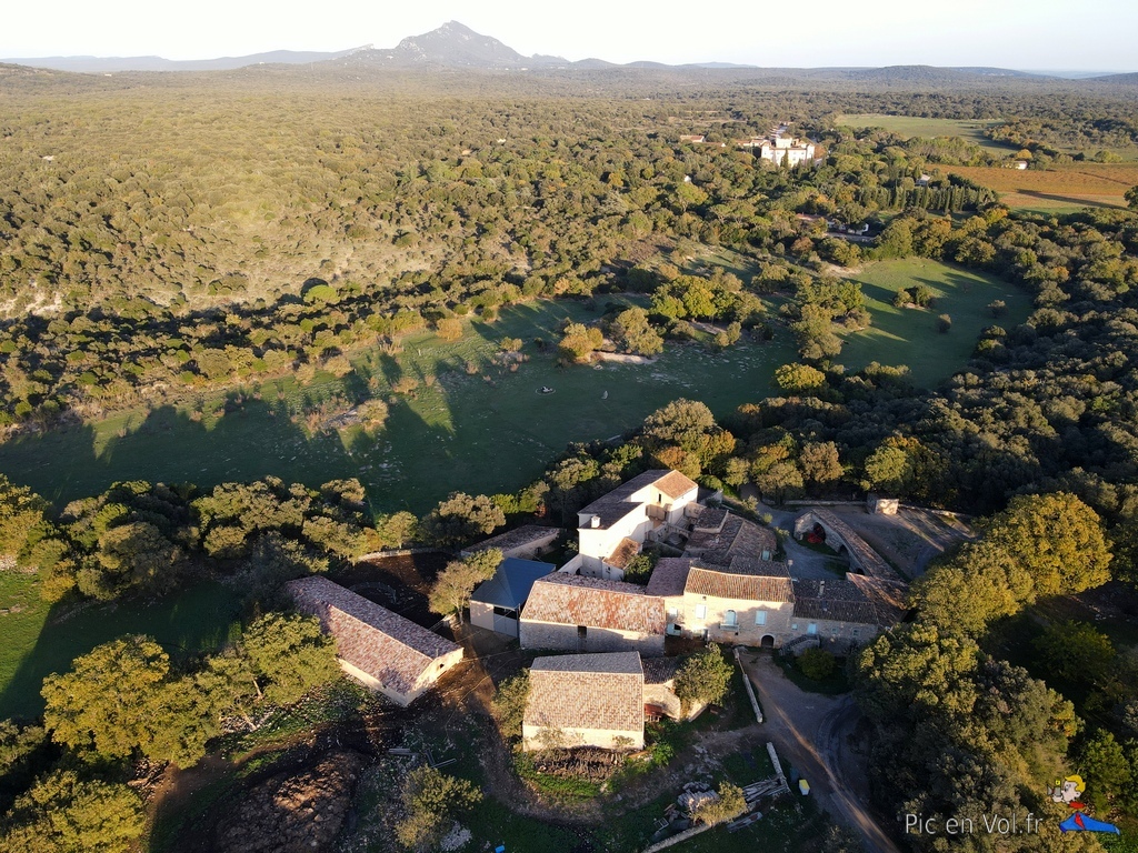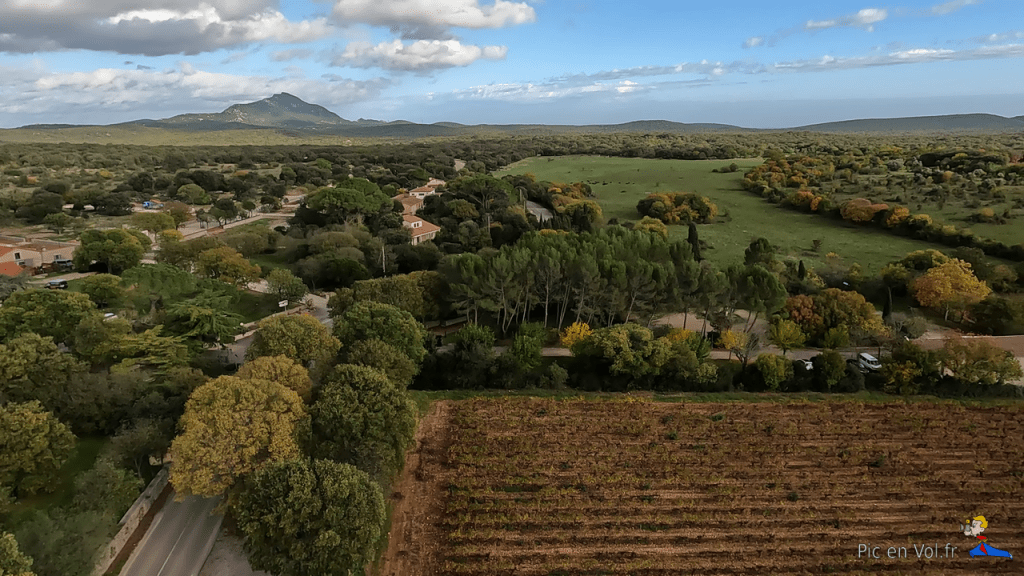 Dans ce lieu, c’est le point de départ des randonnées vers les grottes, les avens et le site préhistorique de Cambous2, la rencontre pastorale avec les bergers du domaine départemental de Roussières. C’est aussi un espace naturel où il est encore possible de s’isoler, de contempler sereinement les paysages, loin des foules et de l’agitation urbaine. À notre arrivée, nous avons été surpris par l’effervescence du chantier en cours dans le village en pleine croissance, vers l’Est. Nous avions cherché un site d’envol pour Kaper (photographier par cerf-volant) de belles images, vues d’en haut, sur le plus ancien village de France (Néolithique et 2 700 ans avant notre ère). Dans l’amphithéâtre de verdure, à côté de la salle des fêtes sur l’esplanade, un orchestre répétait en égrainant de jolies notes. Si l’ambiance était festive, la hauteur des arbres interdisait tout envol. C’est donc sur un chemin viticole, que nous avons trouvé une piste de décollage. Nous sommes, ici, sur le vignoble réputé du Pic Saint-Loup, où la vigne est bien sûr omniprésente. Une amicale brise d’ouest a emporté à plus de 100 m notre matériel vidéo. Nous avons tout d’abord survolé la petite auberge « Lou Sounal », puis le château de Cambous3, puis, le paysage s’est révélé d’une façon impressionnante et splendide avec le majestueux « Pic « sur fond de scénographie. La lumière et des couleurs d’automne éclairaient l’un des plus beaux tableaux aériens qu’il nous ait été donné de photographier depuis le ciel, avec nos cerfs-volants. Mais, ici aussi, l’extension inexorable du village est en route.