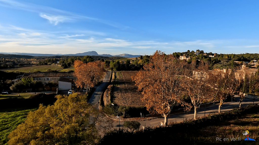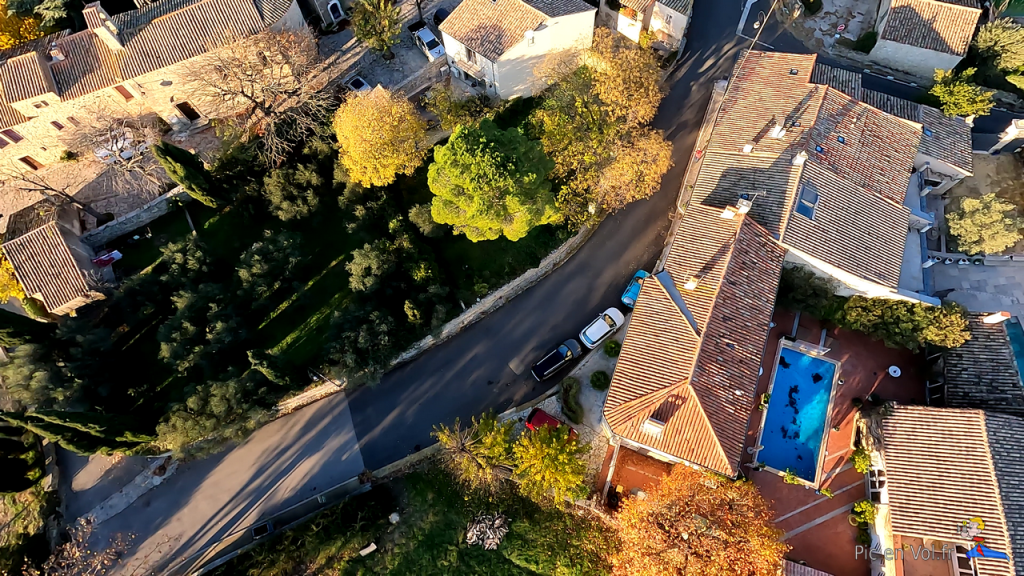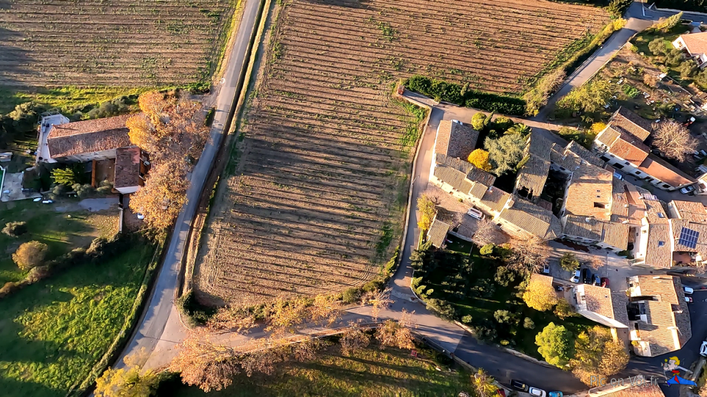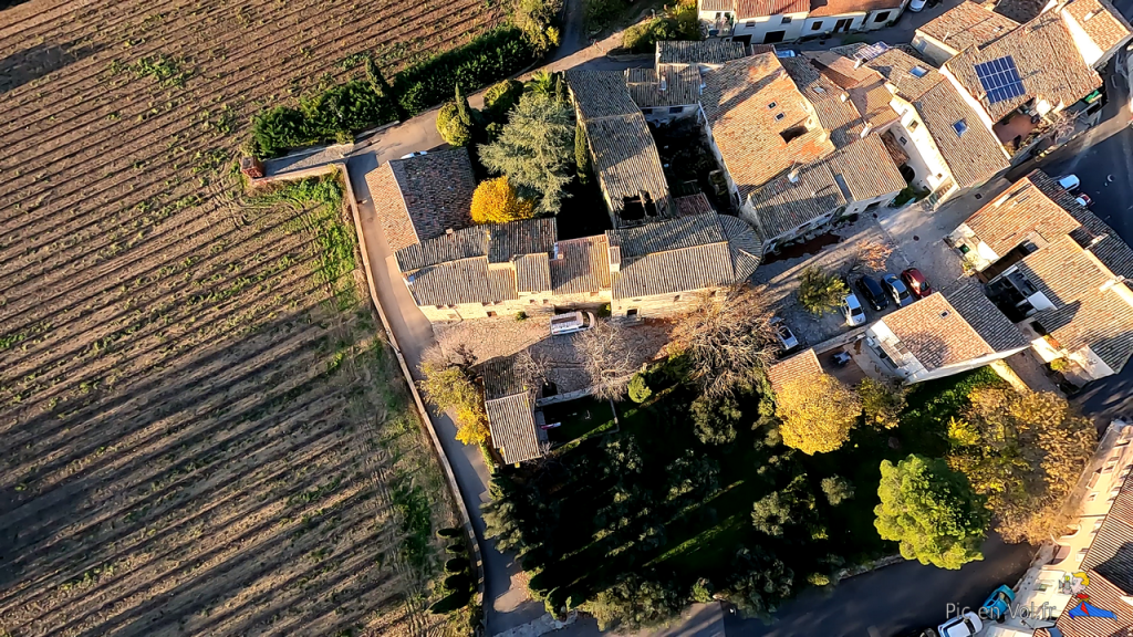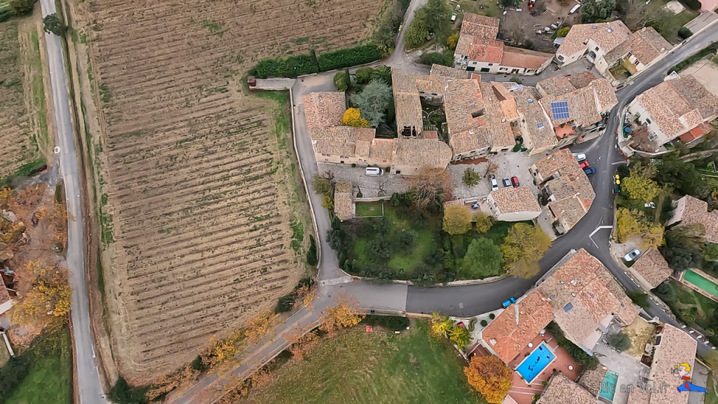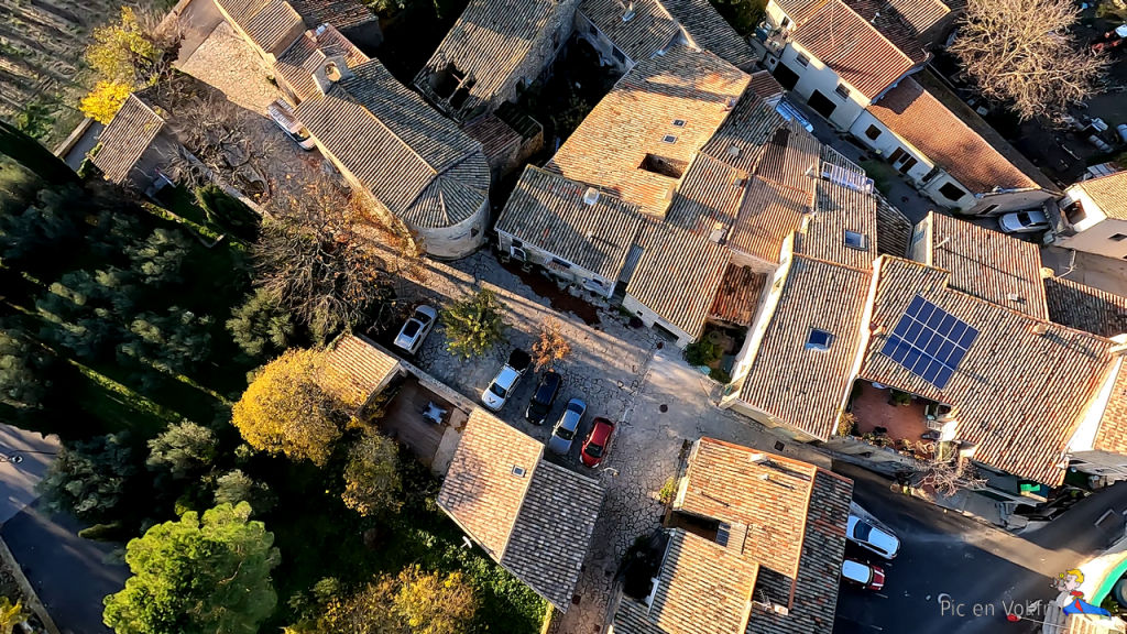 Au milieu des champs, des vignes et des forêts, Guzargues1 fait figure de village gaulois, déserté aux heures de la journée où nous l’avons survolé, mais ce n’est qu’une impression, car ici on cultive, parait-il, la fête des « Lous Pledaïres2 » et la tradition des banquets villageois. Voilà une coutume qui pourrait s’inscrire dans la modernité des relations de proximité que nous devrions cultiver demain. Une première visite, par une météo menaçante d’un automne 2022 particulièrement chahuté par des dépressions de nord-ouest, dans le but de rechercher une piste d’envol. Nous avions tenté notre chance sur un chemin viticole, en face de l’église Saint-Michel, patron protecteur du village. Une vaine tentative, vu l’aérologie du relief et quelques atterrissages, pas vraiment maitrisés, au milieu des pieds de vignes. Les Guzauguois ont su se protéger des vents du nord, les habitants des origines avaient ce bon sens paysan de savoir exploiter le relief, mais pour notre activité cela ne nous arrangeait pas. En désespoir de cause, nous avions décidé de frapper aux portes et celle d’une maison mitoyenne à une prairie, proche de l’église. Notre hôte, intrigué par le projet, nous avait donné son autorisation, sans hésiter. Lorsque nous avons enfin réussi à faire décoller nos cerfs-volants, la lumière s’était éteinte derrière quelques nuages menaçants… Toutes les conditions étaient enfin réunies, huit jours plus tard : un vent de « cinéma », une lumière des heures dorées, des couleurs automnales… Le vol allait être sublime et il le fut. En quittant Guzargues, les habitants revenaient de leurs activités citadines. La communauté reprenait vie sous la protection d’un « Archange dans l’Azur », celui des armoiries de Charles d’Hozier, fondateur du village. Ici, on ne badine pas avec l’histoire et chaque nouveau citoyen de ces lieux doit en tenir compte, l’authenticité est à ce prix.