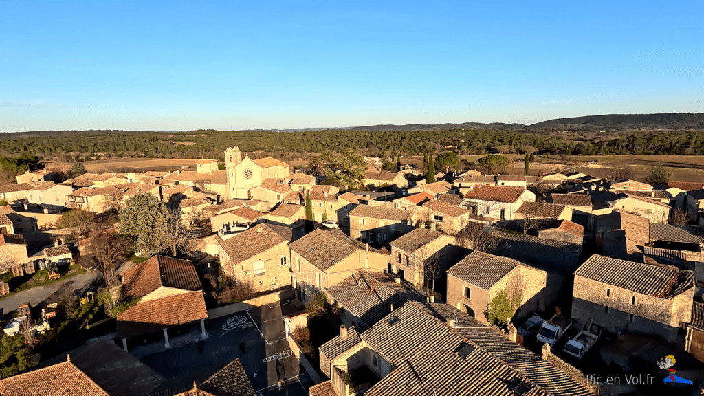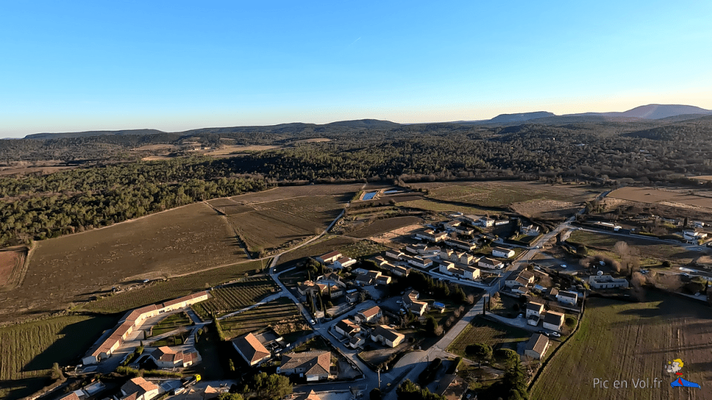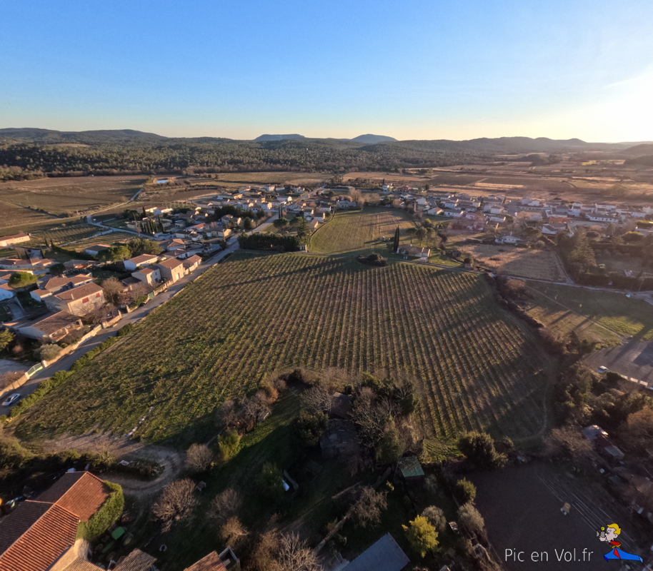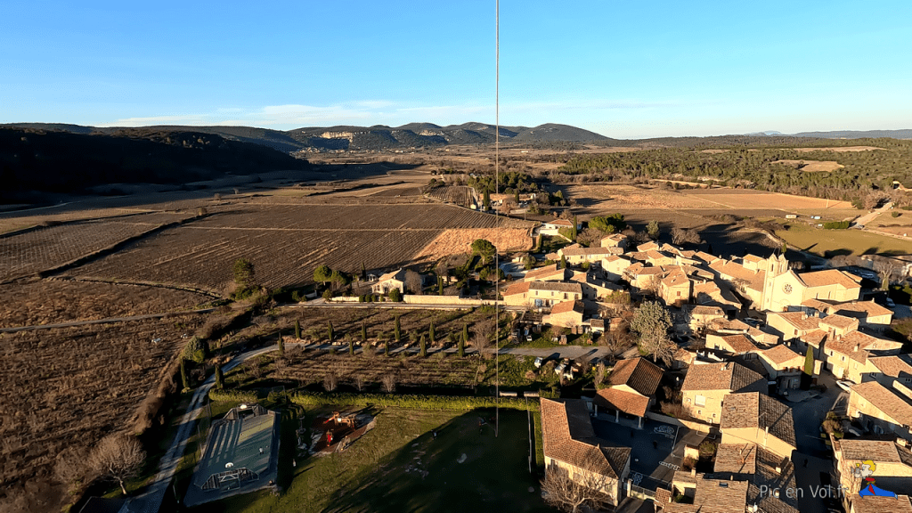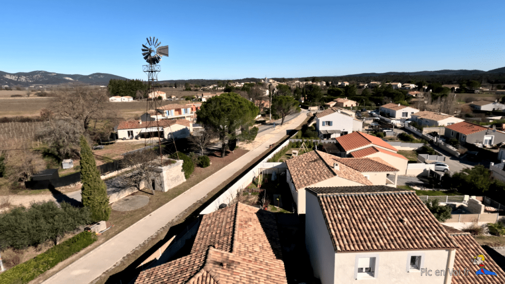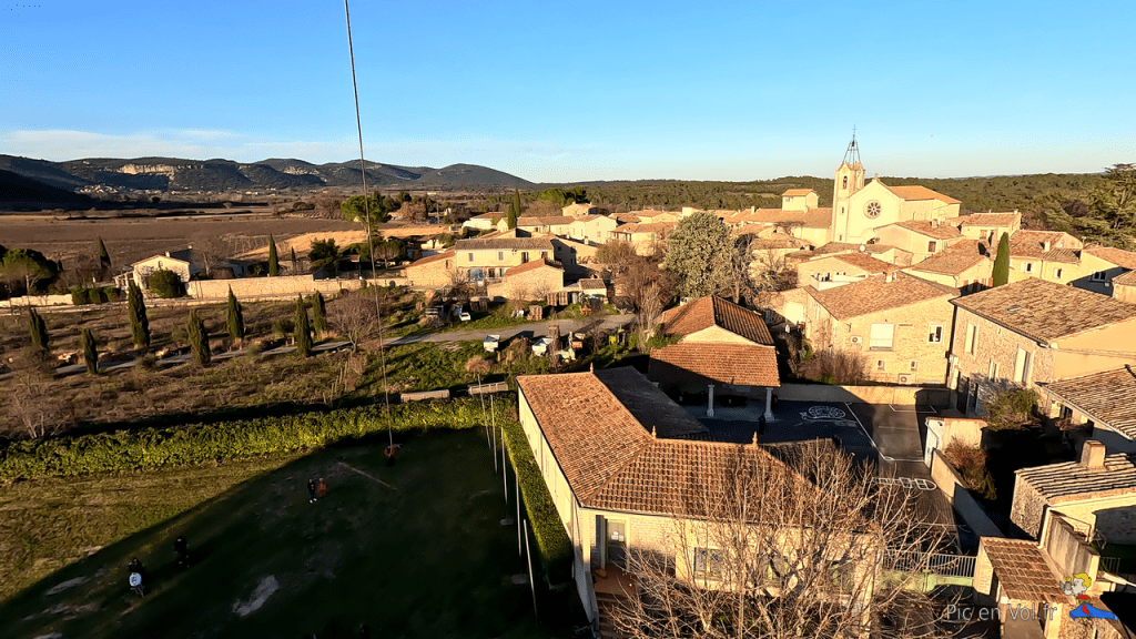 C’est presque par hasard que nous avions « atterri », en fin d’après-midi, sur la plaine de jeux. Quelques dizaines d’enfants couraient, chahutaient joyeusement à deux pas de leur école, sur un bel espace autour de l’esplanade des festivités, du terrain de sport et du jardin d’enfant. Pour profiter de la lumière des heures dorées, nous avions rejoint le village en fin de journée, à l’heure de la sortie des écoles. C’est une envolée de « moineaux » joyeux et bruyants, qui nous avait accueillis. Soudainement parachutés dans une image d’Épinal avec son clocher, sa mairie, sa place et ses platanes et les vignes en lisière des habitations… Il nous fallait saisir l’ambiance et cette image sans attendre, le soleil d’hiver était déjà au déclin. C’est donc en compagnie d’un jeune et enthousiaste public, que nous avons procédé à l’envol de nos cerfs-volants photographiques. Un véritable événement, qui a fait l’unanimité des enfants, des parents et des villageois. Un vent de cinéma (dans le jargon cerf-voliste), une lumière somptueuse, pour une séance de K.A.P en aveugle (sans retour vidéo), qui allait nous donner la meilleure des surprises au «derushage» de nos cartes mémoires. Les enfants de Vacquières nous ont assaillis de mille et une questions pour une leçon d’histoire (celle des cerfs-volants et de la photo aérienne), promus, malgré nous, « maitres du vent », notre terrain de vol s’est transformé en classe de plein air. Nous avons, finalement, dû revenir pour kaper la vieille éolienne qui pompait l’eau depuis les couches profondes du sous-sol. Une autre visite, en milieu de journée cette fois, qui a réveillé le sentiment nostalgique du souvenir de notre village, celui de notre enfance et la mémoire des histoires des « lettres de mon moulin » d’Alphonse Daudet.