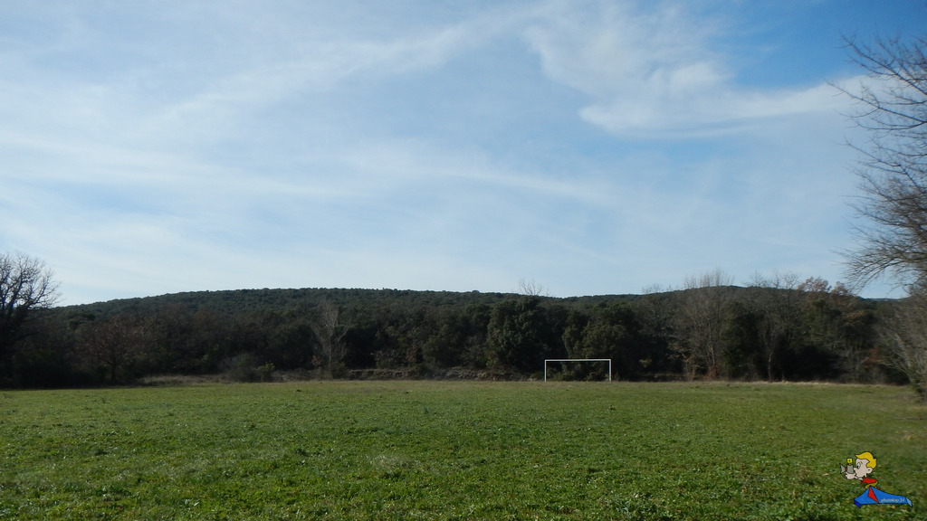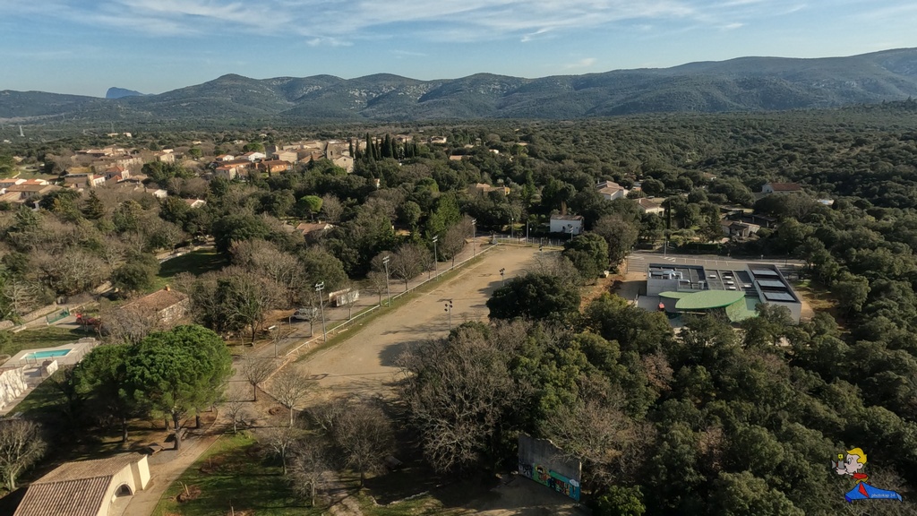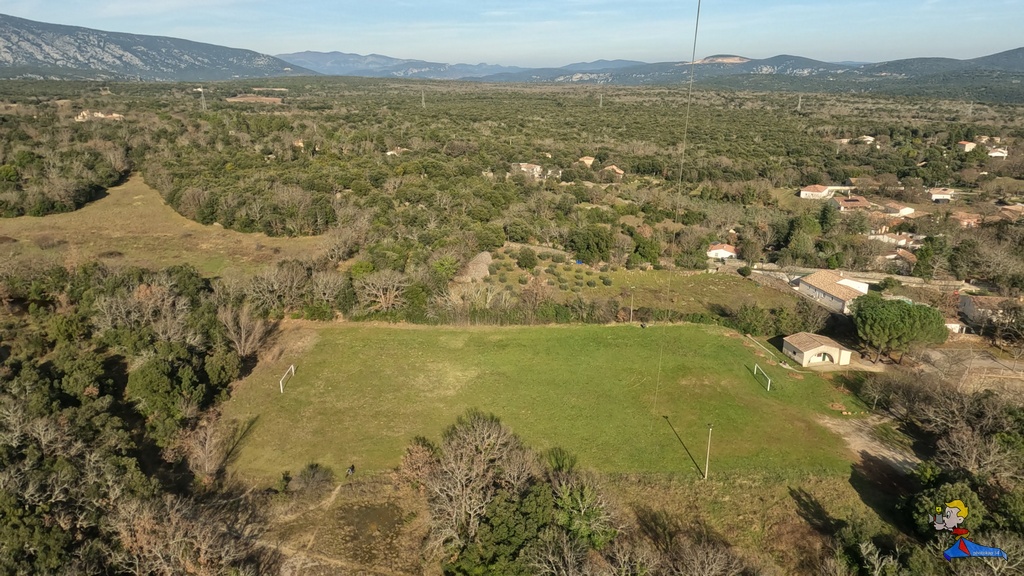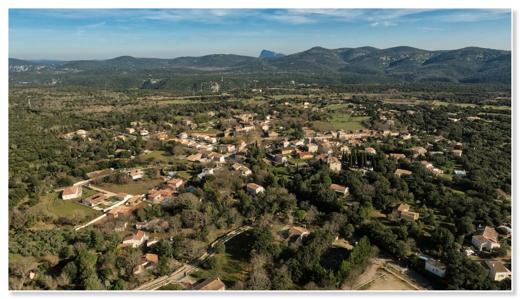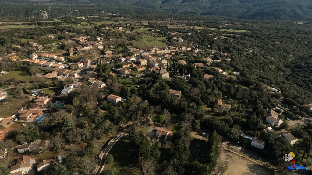 Nous avons, comme à notre habitude, arpenté les ruelles depuis la mairie, jusqu’à la route des gorges, en passant par l’église et le cimetiére. Une exploration rondement menée, car ce village est petit, avec moins de 500 âmes. Les quelques habitations serrées les unes aux autres, comme pour se protéger des vents froids d’hiver ou des canicules de l’été, ne laissent aucun espace dégagé pour faire décoller nos cerfs-volants. Peine perdue, aussi sur la place arborée avec en son milieu une petite mare, vestige probable d’une lavogne2 pour les troupeaux de moutons d’une économie pastorale oubliée et qui a survécu au passage des siècles. Pourtant, le territoire est vaste, mais boisé et tous les espaces dégagés sont occupés par des propriétés, des bâtiments ou des prés clôturés. Heureusement, le réseau GSM est ici bien connecté et cela nous a permis de repérer, sur une vue satellite, un stade de tambourin3 et celui de foot, seuls terrains en principe suffisamment dégagés pour pouvoir réaliser notre reportage aérien. Notre envol eut quatre témoins : un papy et son petit fils, les yeux écarquillés au retour du cerf-volant, pour eux, un vrai géant (prés de 5 m quand même), et deux adolescentes les yeux rivés sur leur smartphone. Trois générations, trois relations bien différentes à la réalité du temps présent. En leur tendant une carte expliquant notre démarche photographique, elles ont eu l’air intéressé, mais ont vite replongé dans leur univers virtuel, peut être pour aller voir ,sur notre site WEB, le magnifique environnement où elles vivent.