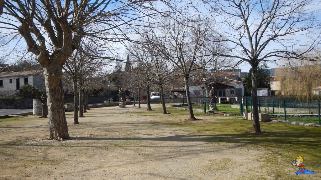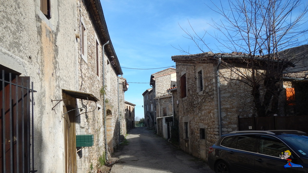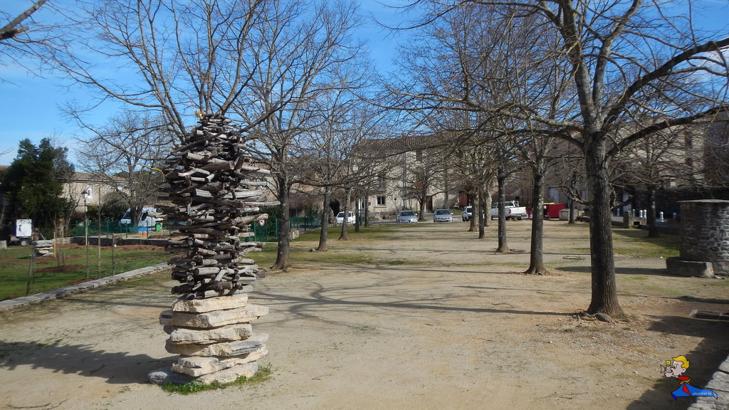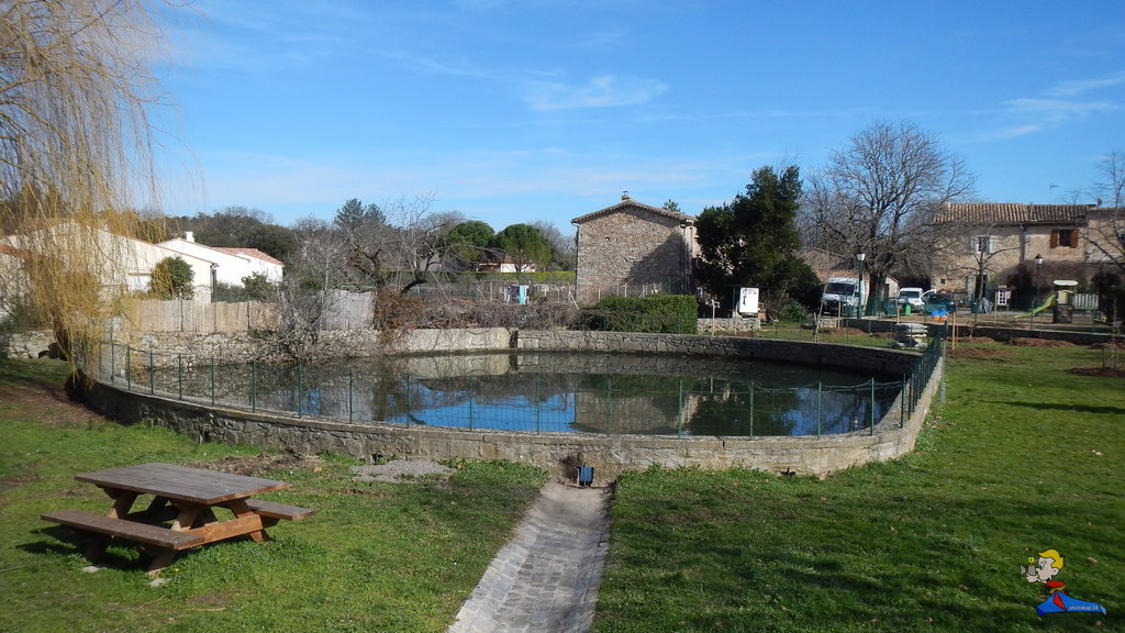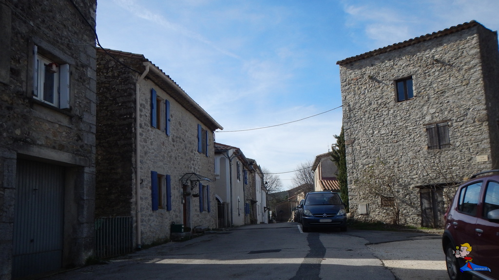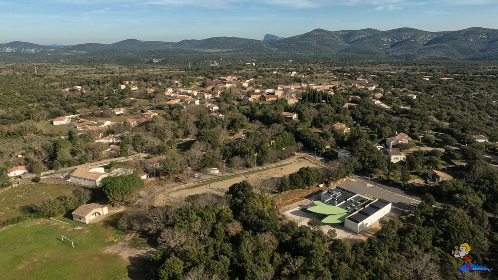 Nous avons, comme à notre habitude, arpenté les ruelles depuis la mairie, jusqu’à la route des gorges, en passant par l’église et le cimetiére. Une exploration rondement menée, car ce village est petit, avec moins de 500 âmes. Les quelques habitations serrées les unes aux autres, comme pour se protéger des vents froids d’hiver ou des canicules de l’été, ne laissent aucun espace dégagé pour faire décoller nos cerfs-volants. Peine perdue, aussi sur la place arborée avec en son milieu une petite mare, vestige probable d’une lavogne2 pour les troupeaux de moutons d’une économie pastorale oubliée et qui a survécu au passage des siècles. Pourtant, le territoire est vaste, mais boisé et tous les espaces dégagés sont occupés par des propriétés, des bâtiments ou des prés clôturés. Heureusement, le réseau GSM est ici bien connecté et cela nous a permis de repérer, sur une vue satellite, un stade de tambourin3 et celui de foot, seuls terrains en principe suffisamment dégagés pour pouvoir réaliser notre reportage aérien. Notre envol eut quatre témoins : un papy et son petit fils, les yeux écarquillés au retour du cerf-volant, pour eux, un vrai géant (prés de 5 m quand même), et deux adolescentes les yeux rivés sur leur smartphone. Trois générations, trois relations bien différentes à la réalité du temps présent. En leur tendant une carte expliquant notre démarche photographique, elles ont eu l’air intéressé, mais ont vite replongé dans leur univers virtuel, peut être pour aller voir ,sur notre site WEB, le magnifique environnement où elles vivent.