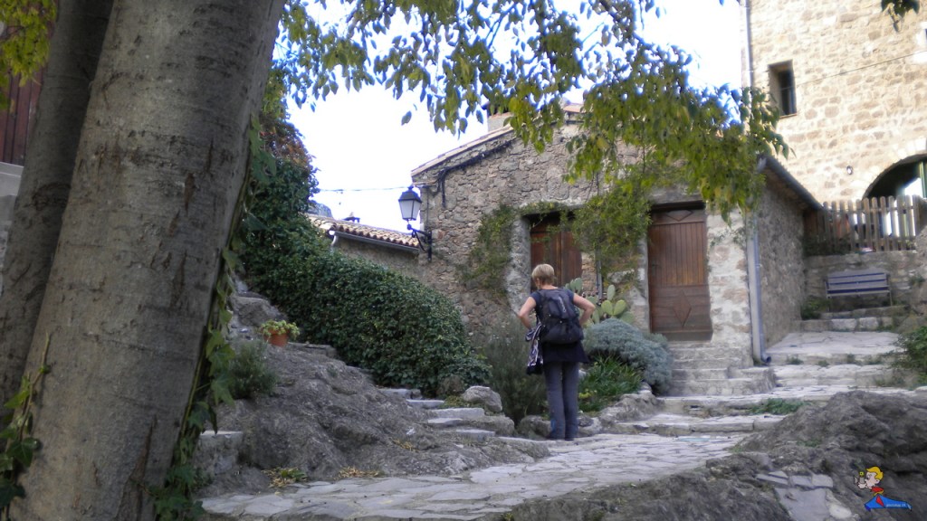 Pour la première fois, depuis fort longtemps, un vent de sud-est soufflait dans l’axe de la vallée, c’est suffisamment rare pour être signalé, car pour toute autre orientation aérologique l’envol des cerfs-volants serait, ici, quasi irréalisable. La vallée de Pégairolles est blottie au fond de la résurgence de la Buèges, cernée par la Séranne3 à l’ouest et le Causse-de-la-Selle à l’est, elle a su se mettre sous la protection du relief. Voler dans cet endroit relevait donc de l’utopie, de plus, le village est perché sur un piton rocheux surmonté par les vestiges d’un château médiéval dont il ne reste qu’une tour carrée, qui est, elle aussi, source de turbulences compliquées à gérer. C’est donc dans la seule ruelle (la Tuilière), dépourvue d’obstacles aériens, que nous avons préparé l’envol de notre grand delta de cinq mètres d’envergure, sous le regard sceptique et perplexe de notre tahitien. Décollage réussi et stabilisé à plus de 100 mètres au-dessus des toits, notre invité n’aura pas résisté à l’envie de suspendre son « Ricoh G3 » afin de réaliser un shooting historique par cerf-volant au-dessus de Pégairolles (sans témoins pour apprécier la performance).